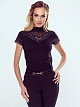 Элегантная блузка с воротником-стойкой и коротким рукавом, отстроченным кружевом. Зона декольте модели декорирована объемной тюлевой вставкой и отделкой из кружева.