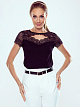 Элегантная блузка с фигурным разрезом на груди и коротким рукавом. Зона декольте и рукава модели выполнены из кружева с цветочно-геометрическим узором.