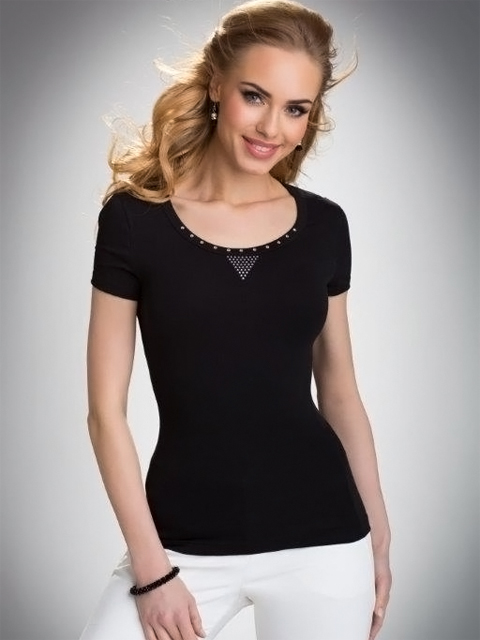 Хлопковая футболка с круглым вырезом и короткими рукавами, на груди аппликация из страз в виде треугольника.