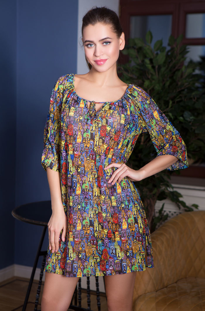 Туника прямого силуэта, с рукавом реглан, выполнена из эластичной сетки с ярким принтом. Круглый вырез горловины полочки и спинки окантован, разрез капелька на завязке. На рукаве по бокам сборка на резинке. По боковым швам - разрезы.