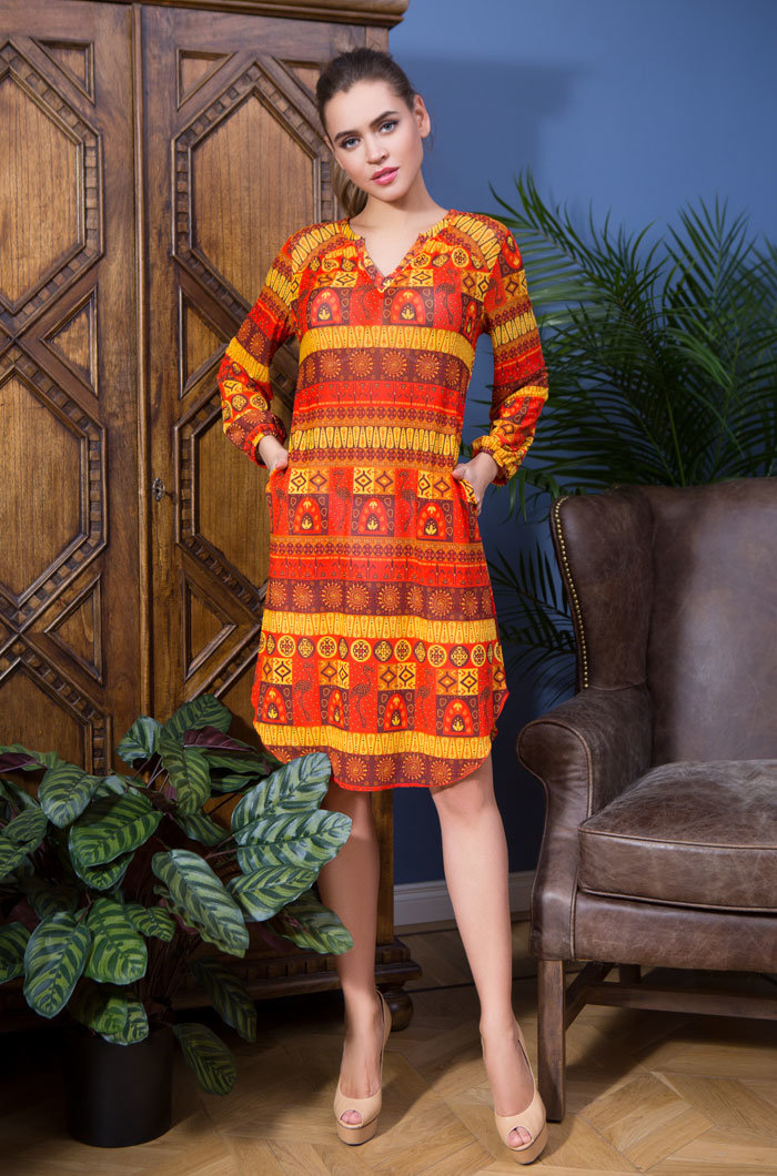 Пляжная туника выполнена из эластичной сетки с ярким принтом. Модель прямого силуэта средней длинны. Длинный рукав на манжете с резинкой. Спинка на кокетке со складками по центру. В боковых швах туники карманы. Горловина и низ рукавов обработаны обтачкой из эластичной однотонной сетки. Фигурный вырез горловины подчеркнут кантом.