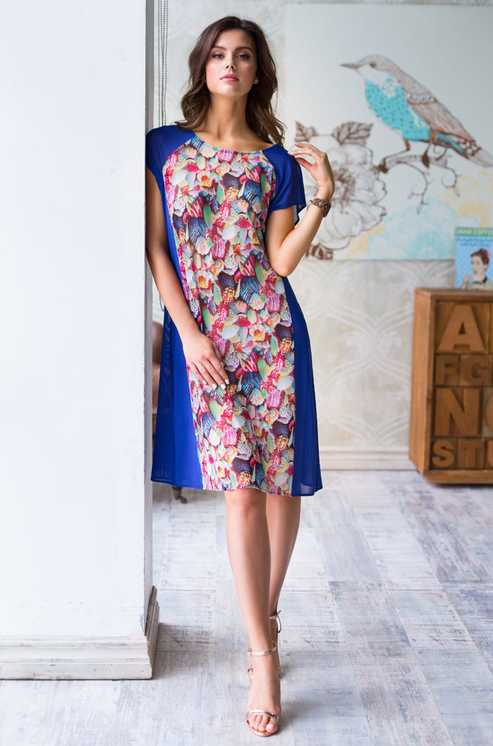 Пляжная туника Mia-Mia средней длины выполнена из эластичной сетки. Модель прямого силуэта с рельефами от проймы и рукавом "реглан". Центральная часть полочки выполнена из ткани с принтом, а задняя часть туники и боковые части полочки выполнены из однотонной. Горловина спинки с разрезом "капелька" и завязкой из принтованной сетки для лучшей посадки по фигуре.